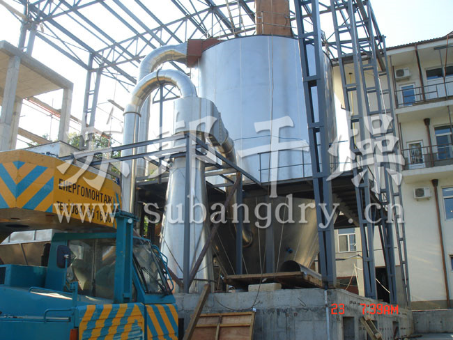 该工艺先将固含量11-12%的原溶液在泵的作用下,连续不断打入“离心喷雾塔”中,迅速蒸发,大部分产品从雾塔底部经卸料阀排出,其余产品进入旋风分离器喷分离出来。高温尾气在高负压的作用下,进入“除尘塔”中,气体经高压引风机排入大气,完成全部工艺过程。产品氯化钙含量在98%以上。