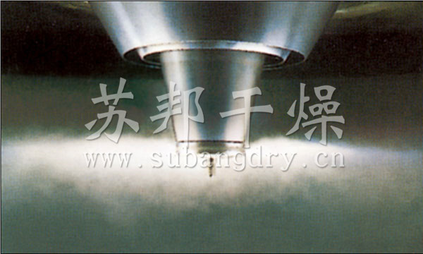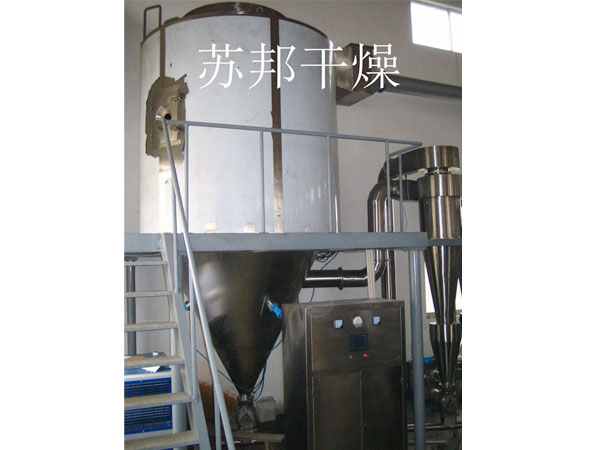空气经过滤和加热,进入干燥器顶部空气分配器,热空气呈螺旋状均匀地进入干燥室。料液经塔体顶部的高速离心雾化器,(旋转)喷雾成极细微的雾状液珠,与热空气并流接触在极短的时间内可干燥为成品。成品连续地由干燥塔底部和旋风分离器中输出,废气由风机排空。